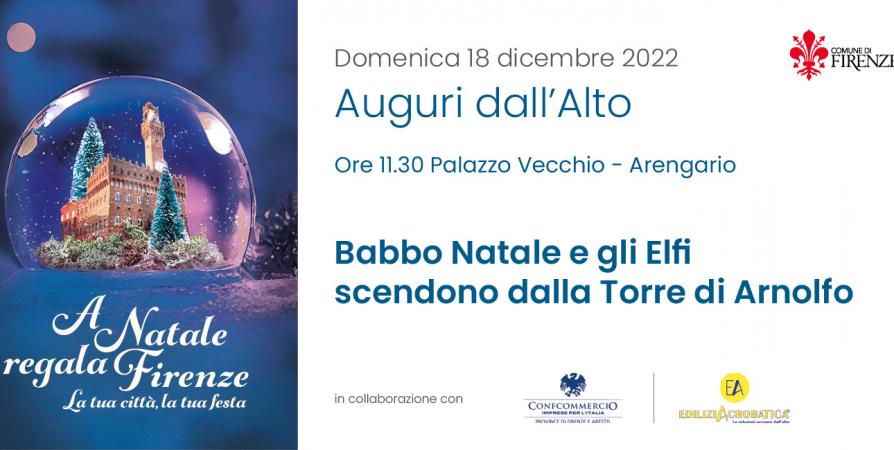Tutto è confermato per l’arrivo in grande stile di Babbo Natale a Firenze. Domenica 18 dicembre, alle ore 11.30, Santa Claus in barba bianca e giubba rossa si calerà dalla torre d’Arnolfo insieme ai suoi aiutanti elfi, offrendo uno spettacolo mozzafiato a grandi e piccini che lo potranno ammirare a testa in su da piazza della Signoria.