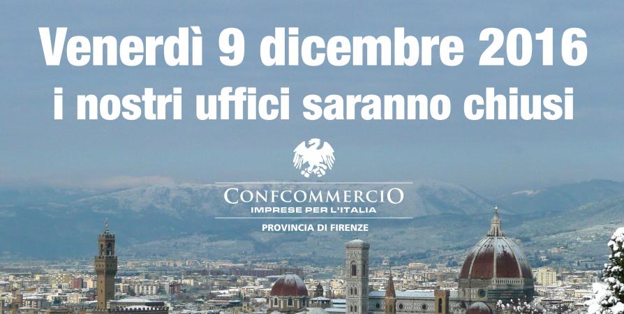 Informiamo che, in occasione della festività dell'8 dicembre, il giorno venerdì 9 dicembre 2016 gli uffici di Confcommercio Firenze, società ed enti collegati rimarranno chiusi per l'intera giornata.